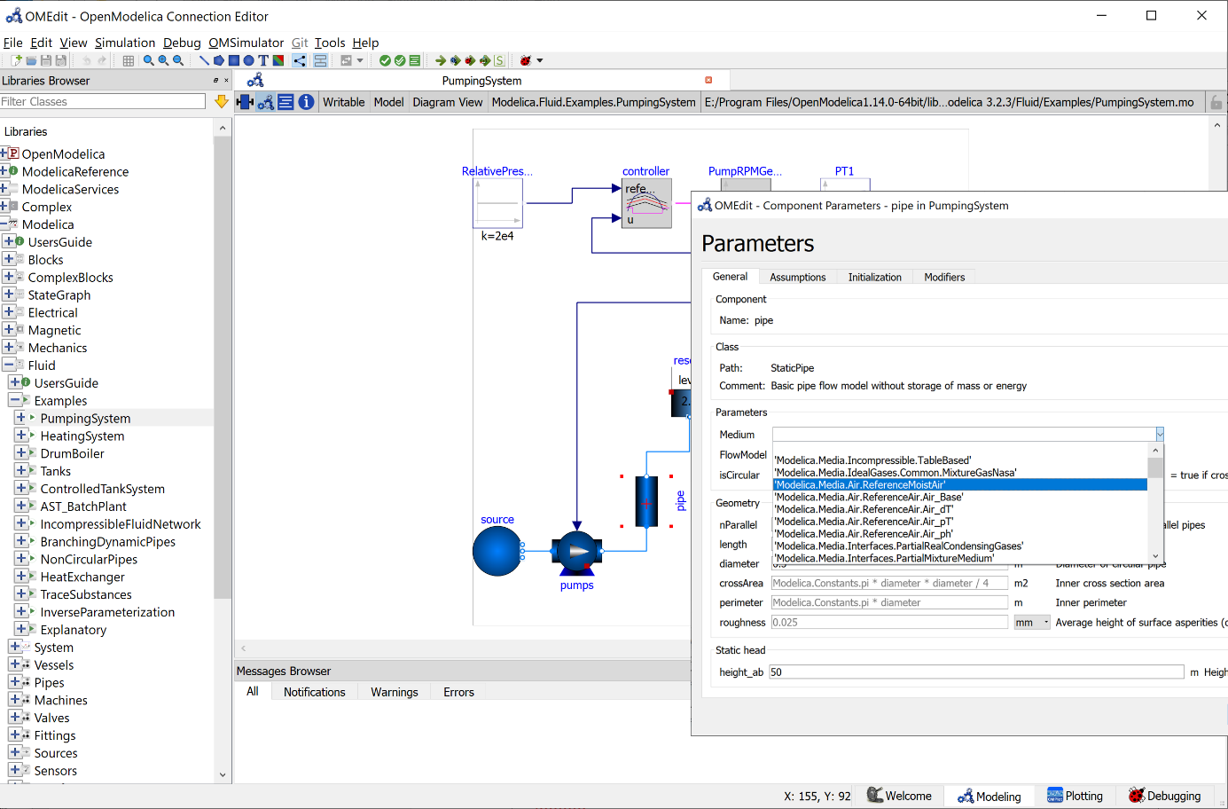 The figure shows OpenModelica while editing pump component inside PumpingSystem.