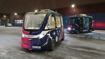 Left: Technical visit to the Road and Traffic Institute showing the project regarding self-driving buses at Linköping University campus.
